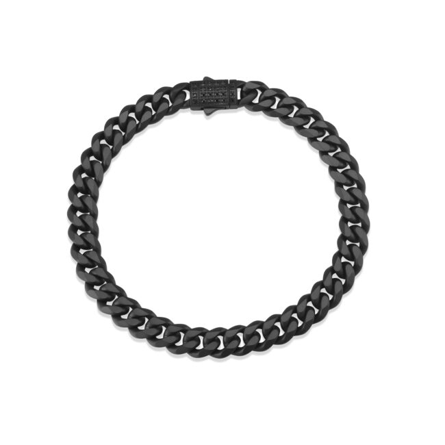 High-end matte finish 6-sided Miami Curb Chain with rounded double tab clasp inlaid with black/white/blue CZs, Available in widths 6/8/10/12/14mm and lengths 7.5/8/8.5/9/18/20/22/24 inches