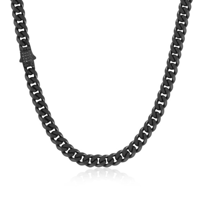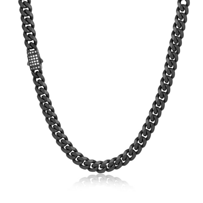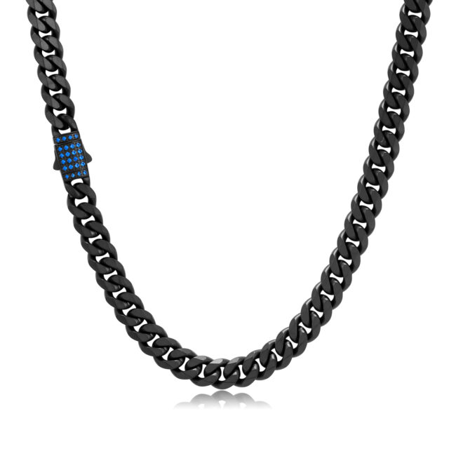High-end matte finish 6-sided Miami Curb Chain with rounded double tab clasp inlaid with black/white/blue CZs, Available in widths 6/8/10/12/14mm and lengths 7.5/8/8.5/9/18/20/22/24 inches