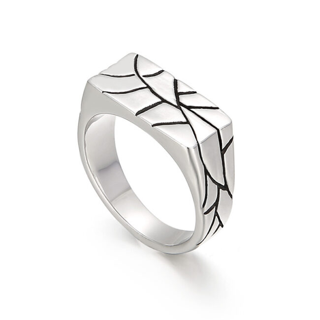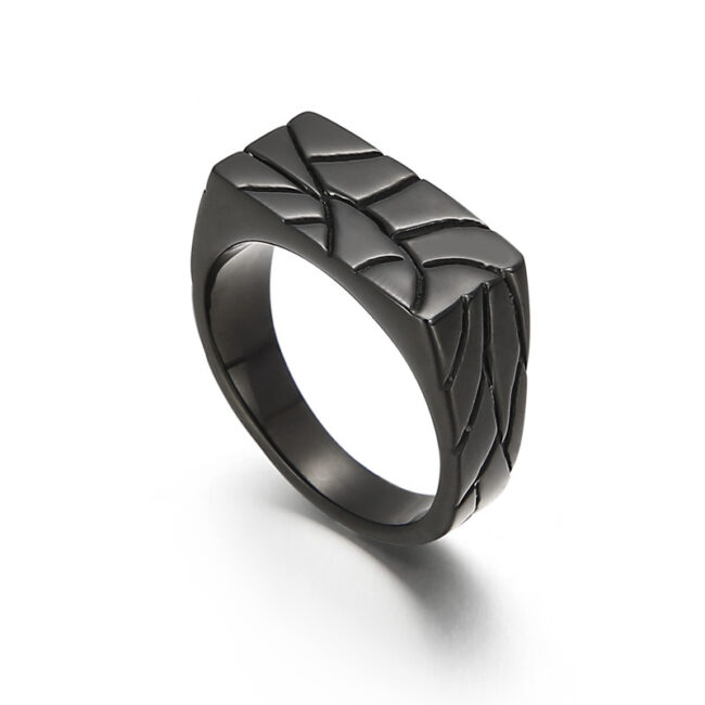 Men’s Polished Stainless Steel Round Signet Ring with Carved Cracked Earth Pattern in IP Black/Gold/Steel colors