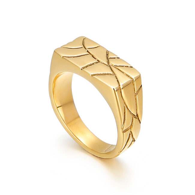 Men’s Polished Stainless Steel Rectangular Signet Ring with Carved Lines Pattern in IP Black/Gold/Steel colors