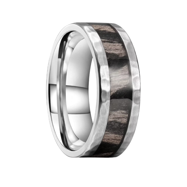 8mm width 316L Stainless Steel Silver Hammered Ring IP Gunmetal Center Inlaid with Wood