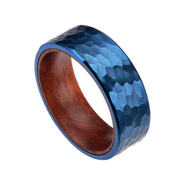 8mm width 316L Stainless Steel blue hammered ring with inner Inlaid by Rose Wood