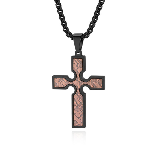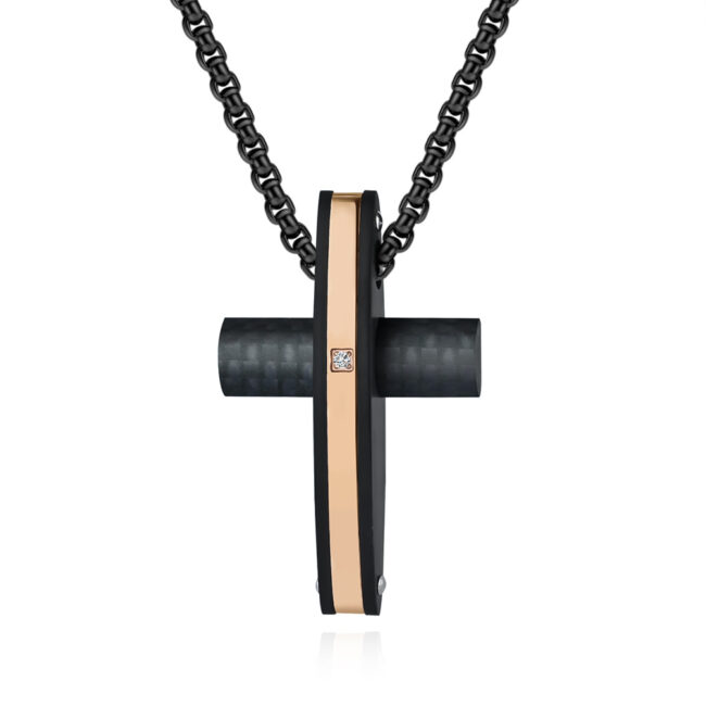 Men’s Stainless Steel and Pure Solid Carbon Fiber Two Tone Cross pendant with inlaid white CZ 5A, in Black carbon fiber and IP Black/Blue/Gold/Steel colors