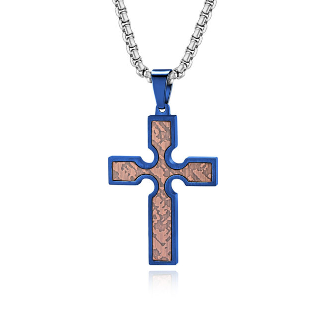 Men’s Stainless Steel Two Tone Cross pendant with inlaid Bronze Pine pattern in IP Black/Gold/Blue