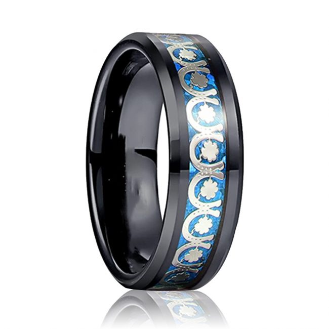 Men’s 8mm Black/Silver Tungsten Carbide Wedding Ring Blue/Black Carbon Fiber & Rose Gold Unique Pattern Inlay High Polished