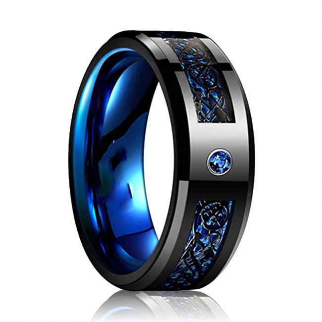 Men’s 8mm Black Tungsten Carbide Ring Blue Rings for Men Blue Carbon Fiber Polished Finish Comfort Fit Size 6-15