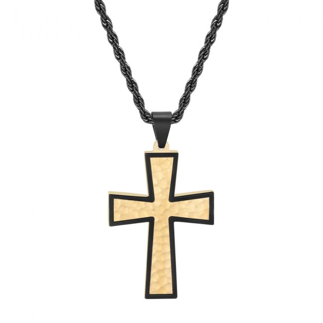 Matte Finished 316L Stainless Steel Hammered Cross Pendant and Black and Yellow Gold IP