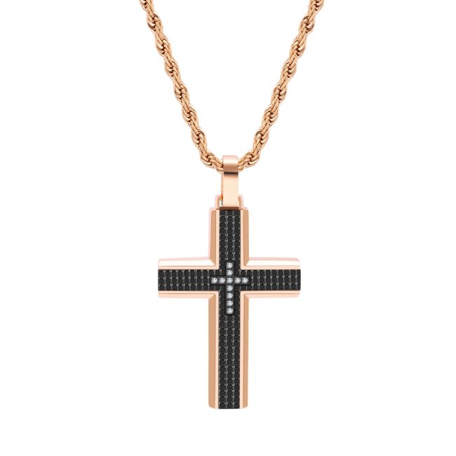 Matte Finished 316L Stainless Steel Cross pendant with gridding pattern CZ inlaid and Black & Rose Gold IP