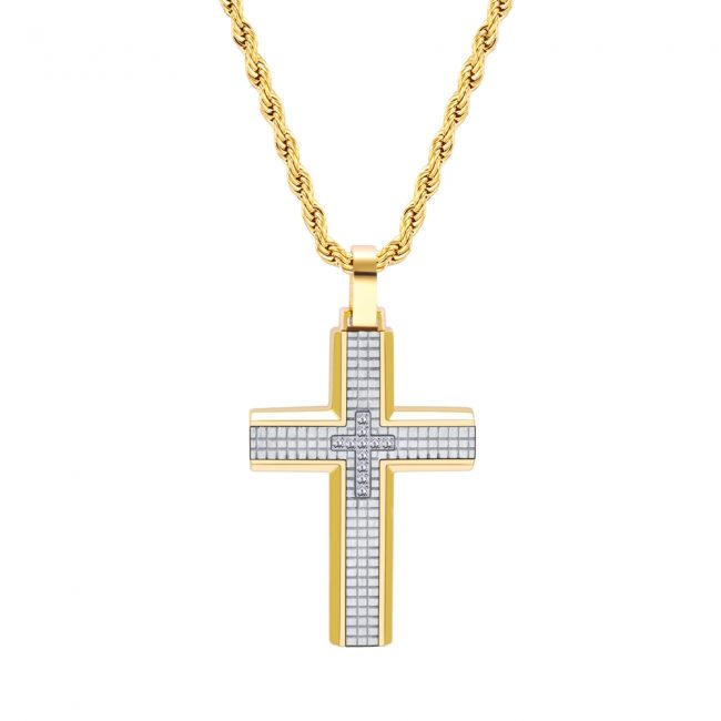Matte Finished 316L Stainless Steel Cross pendant with gridding pattern CZ inlaid and Yellow Gold IP