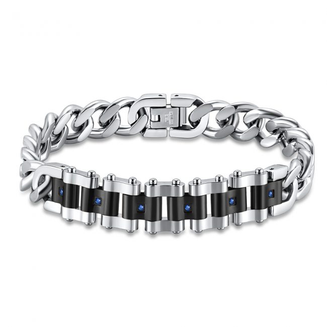 Men’s 316L Stainless Steel High Polished Finished Black Plated Curb Chain Bracelet With Blue CZ
