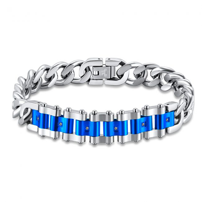 Men’s 316L Stainless Steel High Polishing Finished Blue Plated Links Bracelet With Clear CZ