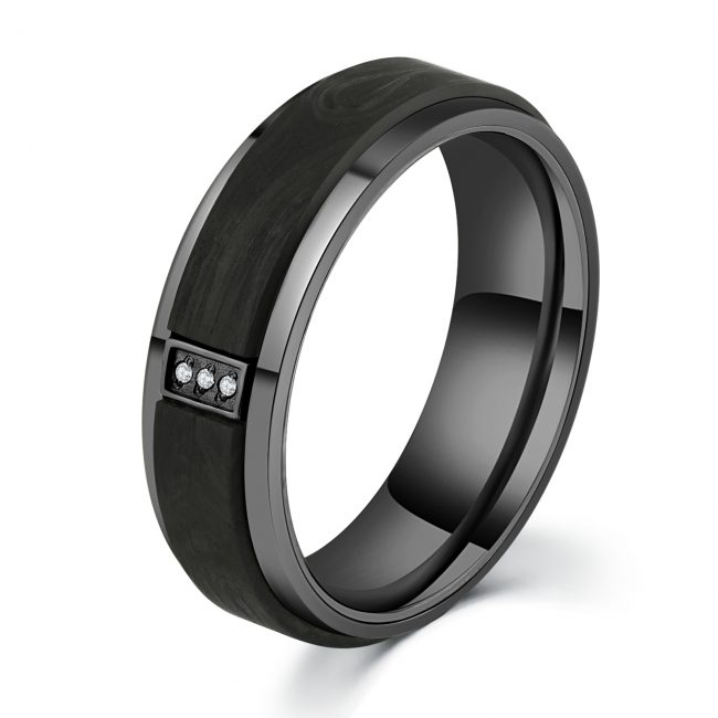 316L Stainless Steel & Forged Carbon Fiber Ring with Black IP Plated and 3pcs White Stones CNC inlaid