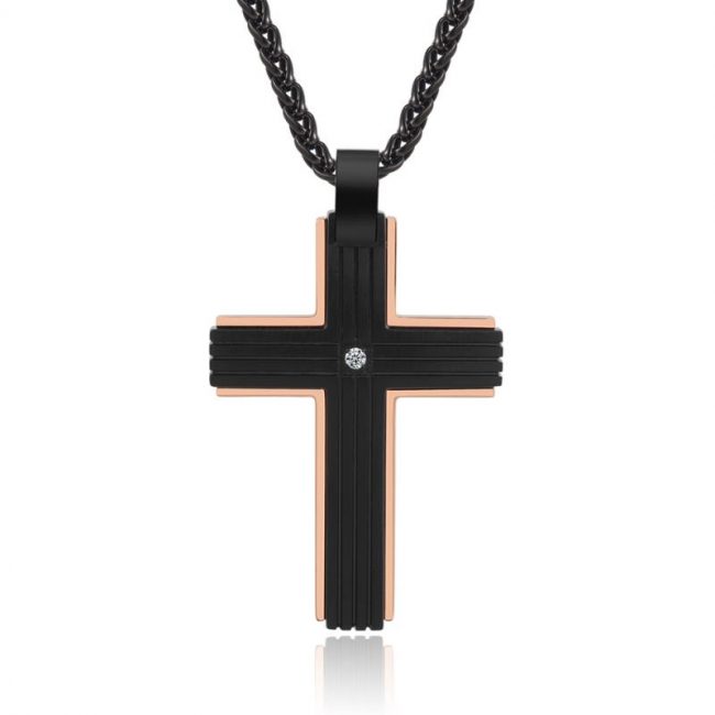 Black & Rose gold IP Plated 316L Stainless Steel Brushed Finish Cross Pendant With White CZ inlaid