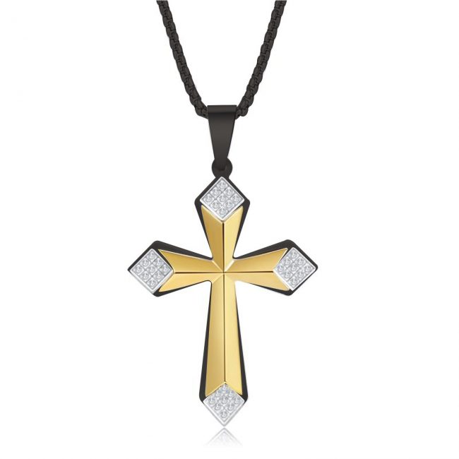316L Stainless Steel High-end Cross Pendant Black & Gold Plated With White CZ & Box Chain