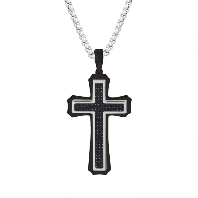 Carbon Fiber Inlaid 316L Stainless Steel Cross Pendant With Round Box Chain