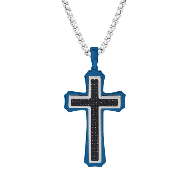 Carbon Fiber Inlaid Blue 316L Stainless Steel Cross Pendant With Blue IP Plated Round Box Chain