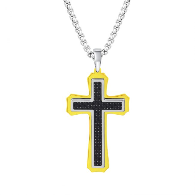 Carbon Fiber Inlaid gold 316L Stainless Steel Cross Pendant With gold IP Plated Round Box Chain