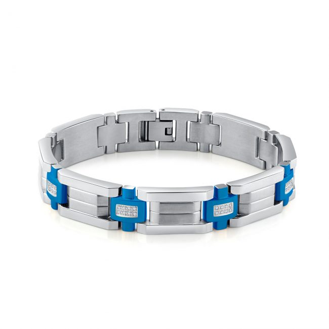 Men’s 316L Stainless Steel Polished Finish Blue Plated Links Bracelet With White CZ