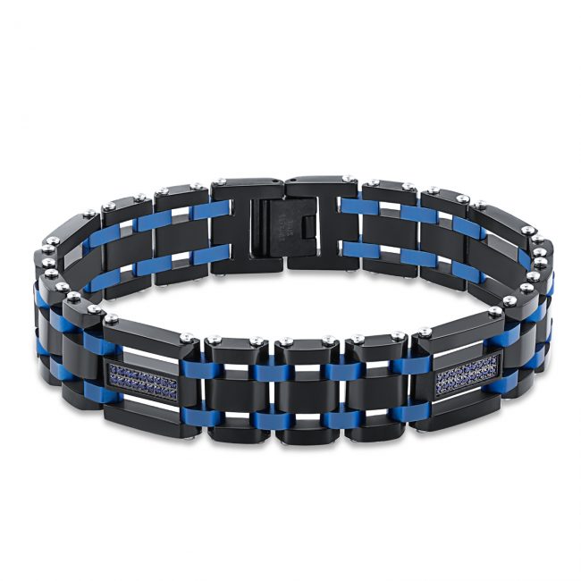 Men’s 316L Stainless Steel Matte Finish Black & Blue Plated Links Bracelet With Blue CZ