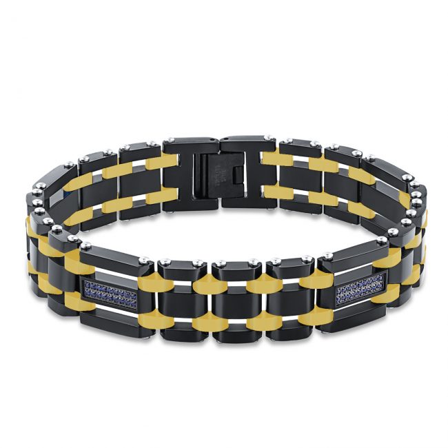 Men’s 316L Stainless Steel Matte Finish Black & Gold Plated Links Bracelet With Blue CZ
