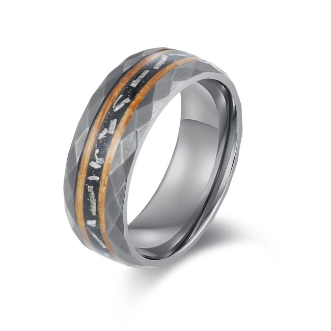 Hammered S.ST ring with natural cask wood & meteorite inlay, as pic