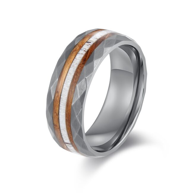Hammered S.ST ring with natural deer antler and cask wood inlaid, as pic