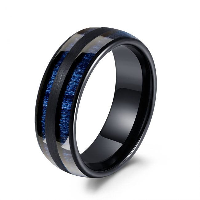 IP Plated Shiny Ring Inlay Blue Silk Texture Paper Wedding Band Dome Style, Available in Stainless Steel and Tungsten Materials