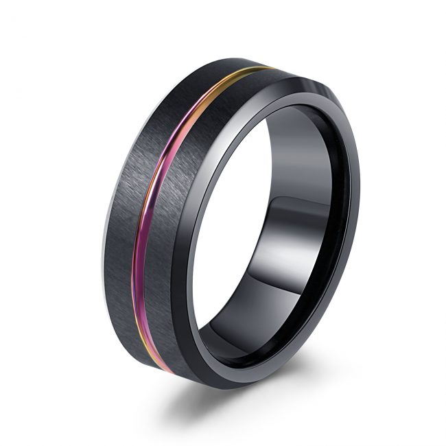 Handcrafted Matte Black & Rainbow IP Plated Ring, Available in Stainless Steel and Tungsten Materials