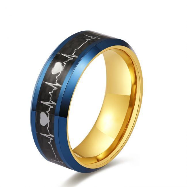 Yellow Gold & Blue IP Plated Polished Heartbeat Pattern With Carbon Fiber Inlaid Ring, Available in Stainless Steel and Tungsten Materials