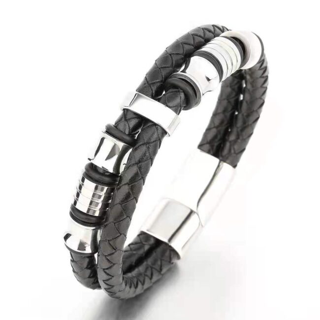 Men’s stainless steel Two Leather Cowhide ropes bracelet in black leather with magnetic clasp