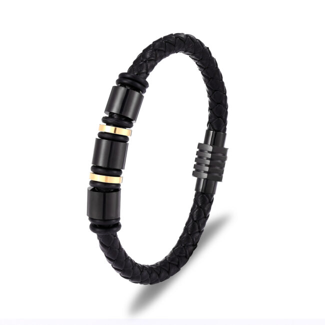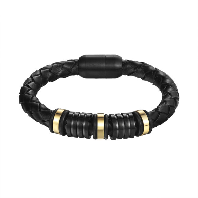 Men’s stainless steel Genuine Leather rope bracelet in black leather with magnetic clasp in IP Black and Yellow Gold