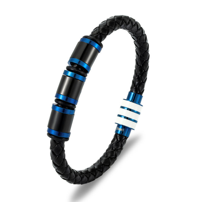 Men’s stainless steel Genuine Leather rope bracelet in black leather with magnetic clasp in IP Black and Blue plating