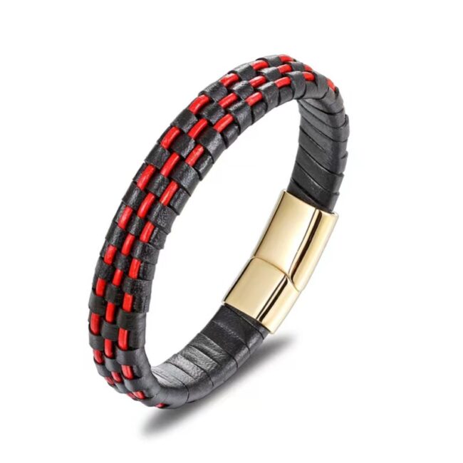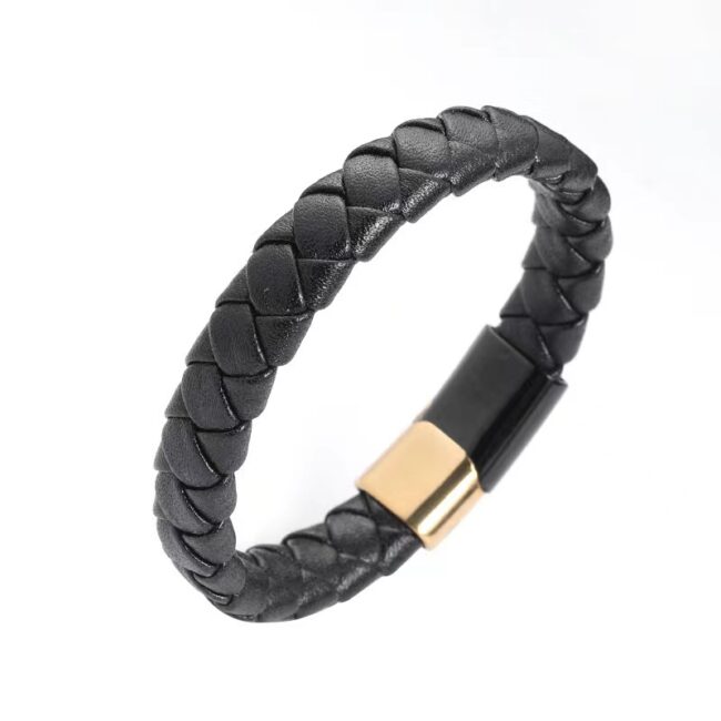 Men’s Cowhide Brown/Black/Blue Leather Woven bracelet/bangle and Stainless Steel IP Gold & Black two tone magnetic clasp