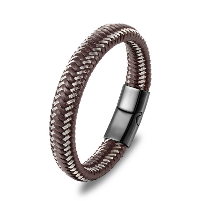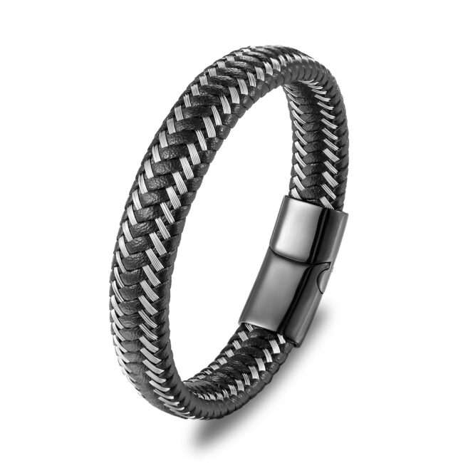 Men’s Stainless Steel with steel wire and leather woven bracelet bangle with magnetic clasp