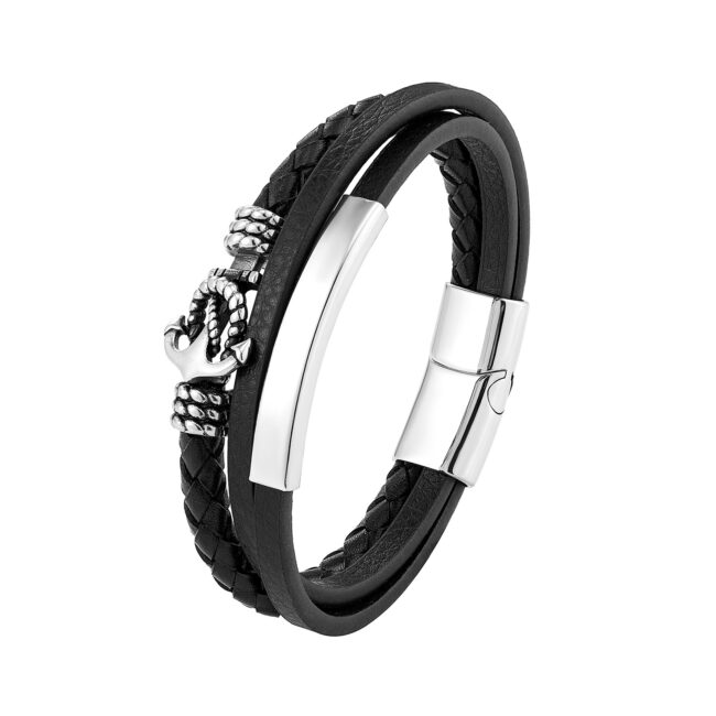 Men’s Multi-Layer Black Leather Combination bracelet with Stainless Steel Rope Sailor’s Knot Bangle with magnetic clasp