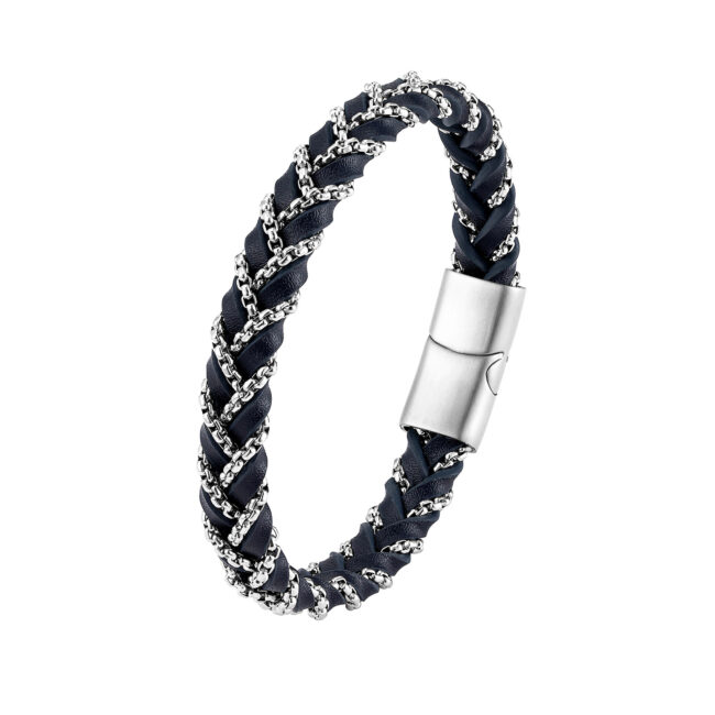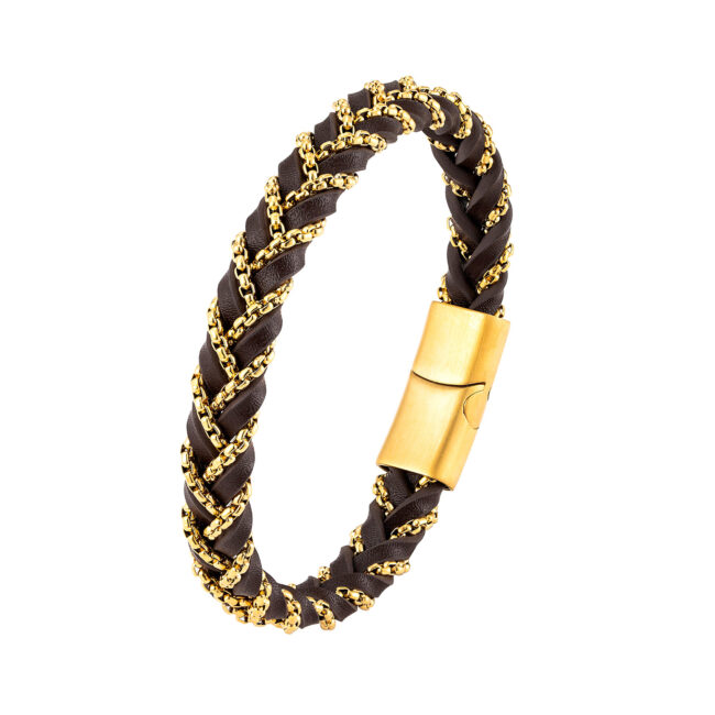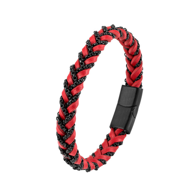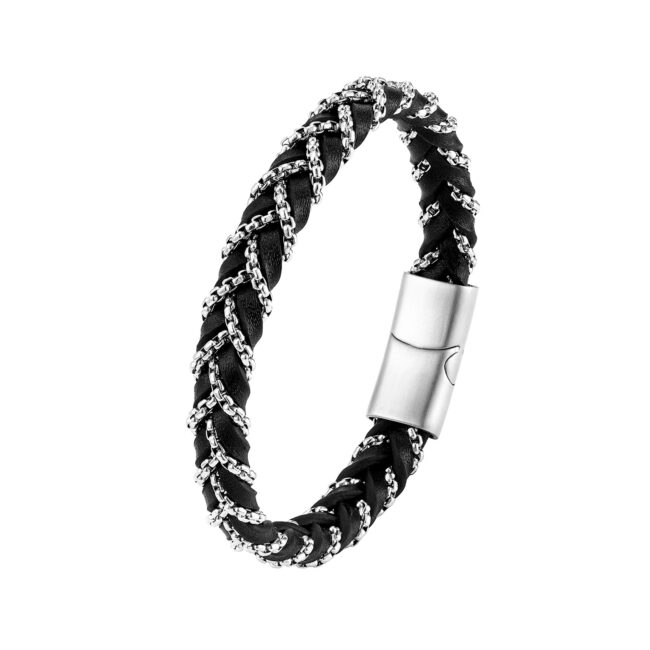 Men’s Stainless Steel Chain Woven in Leather Woven bracelet bangle with magnetic clasp, available in Steel/Black/Gold plating colors and Black/Blue/Brown/Red Leather colors