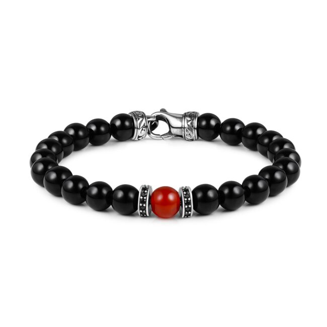 Men’s Stainless Steel beaded bracelet with 8mm black shiny onyx 22pcs, 8mm red shiny onyx 1piece RS1.4mm black CZ=26pcs