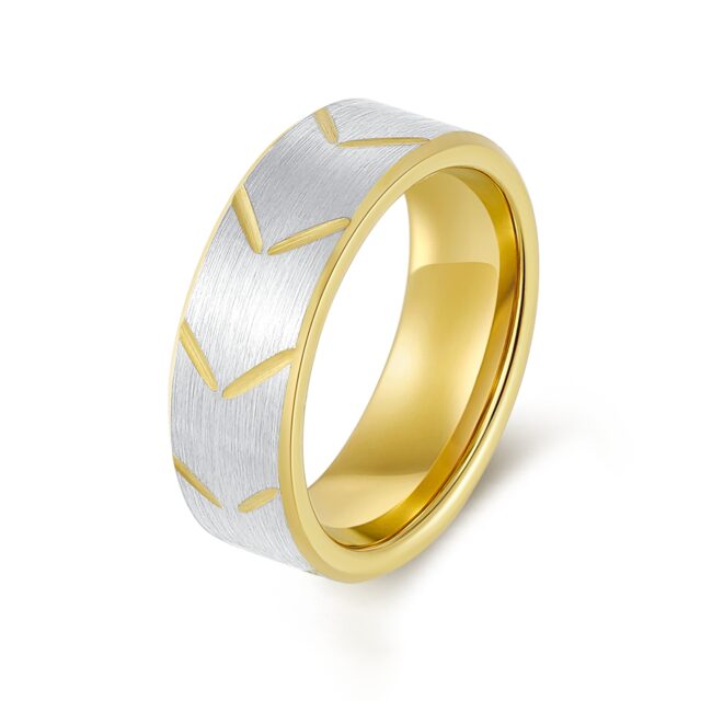 8mm-Tungsten/S.st/Titanium Brushed ring with pattern in IP Black / Yellow Gold