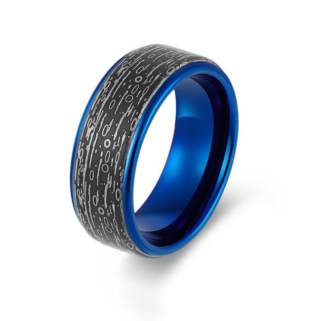 8mm-Tungsten/S.st/Titanium Polished ring with rain pattern in IP Black and Blue