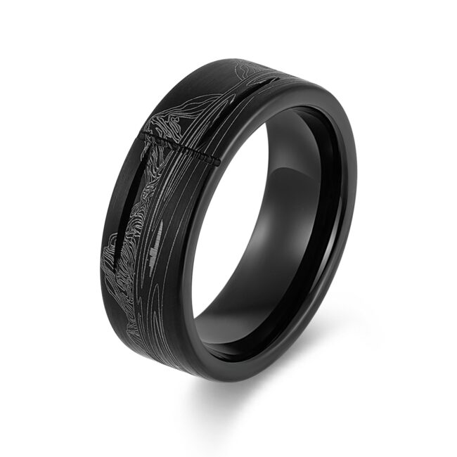 8mm-Tungsten/S.st/Titanium Polished ring with mountains pattern in IP Black