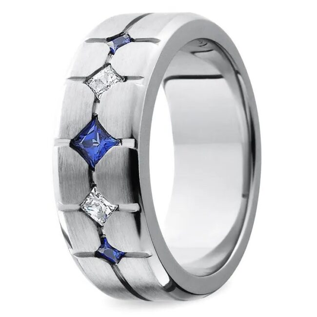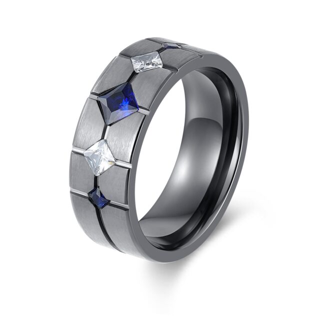 Men’s Brushed and Polished Stainless Steel wedding ring/band with 3 Blue and 2 White CZs