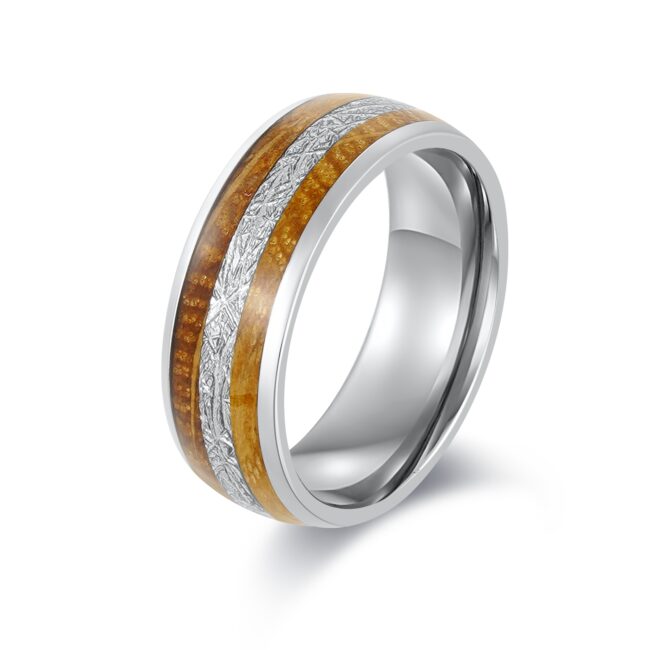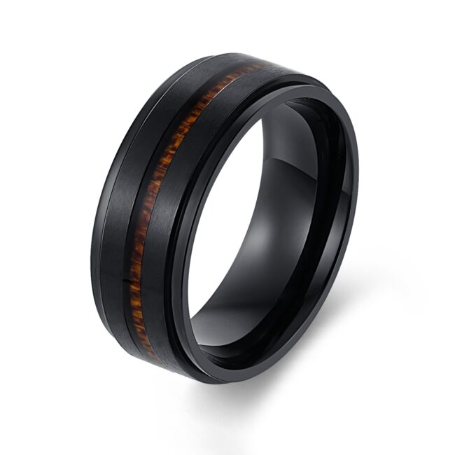 Men’s Brushed and Polished Stainless Steel wedding ring/band with Wood inlay
