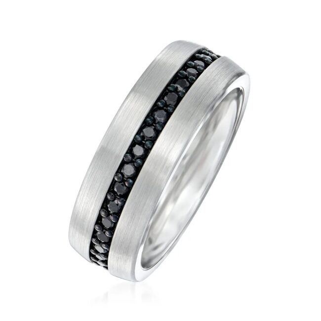 Men’s Brushed Stainless Steel/Titanium wedding ring Smooth Comfort Fit with black CZ inlaid& Silver/Gunmetal IP Plated Color as pic