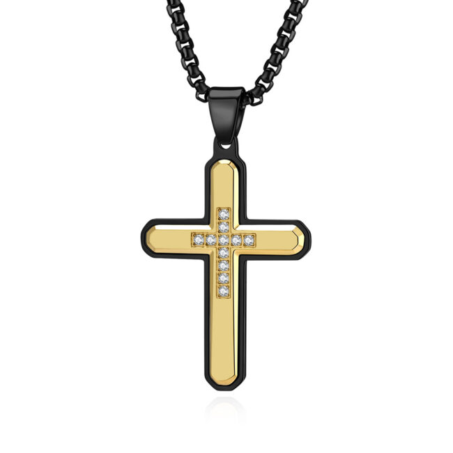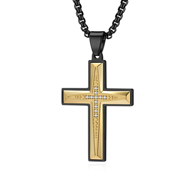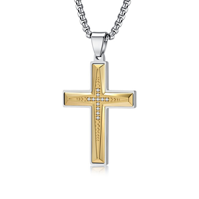 Men’s Stainless Steel Layered Cross Pendant with inlaid CNC set white CZs