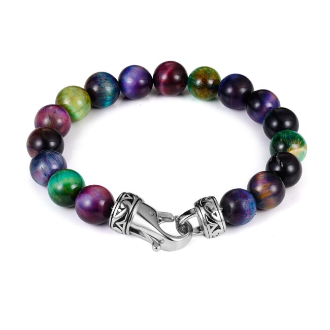 Men’s Stainless steel beaded (10mm with18pcs) bracelet with multi-colored Tiger’s eye stone