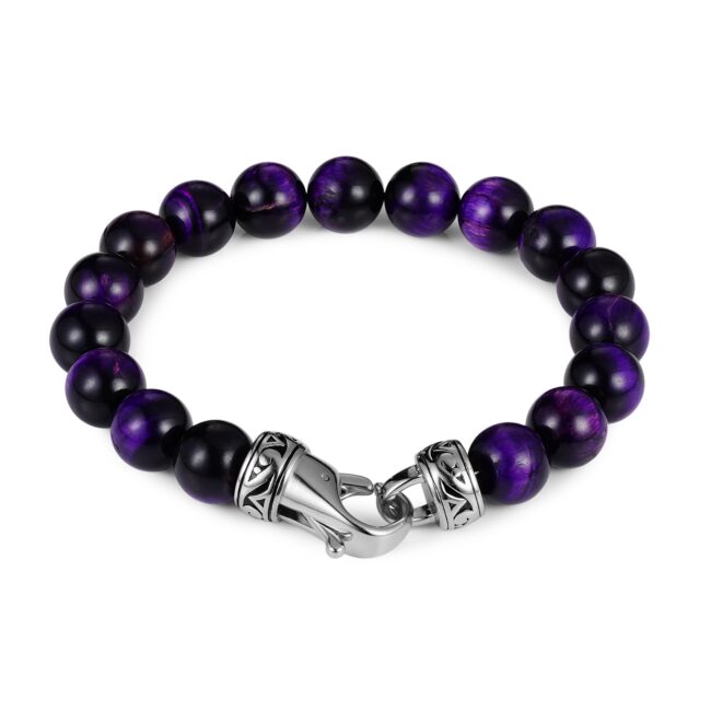 Men’s Stainless steel beaded (10mm with18pcs) bracelet with purple Tiger’s eye, 10mm