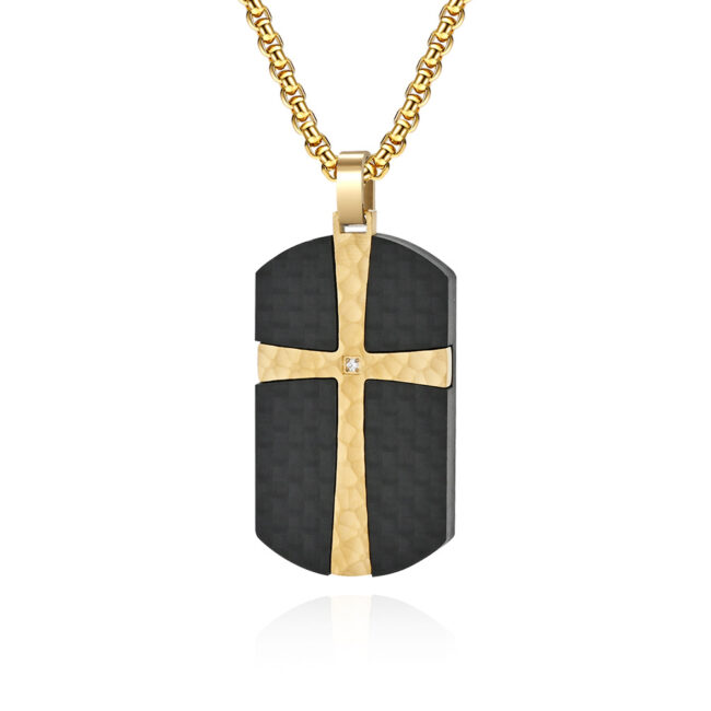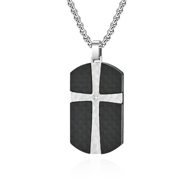 Men’s Stainless Steel Solid Carbon Fiber Dog Tag Pendant with inlaid Hammered Cross and center white CZ, available in steel/gold plating colors