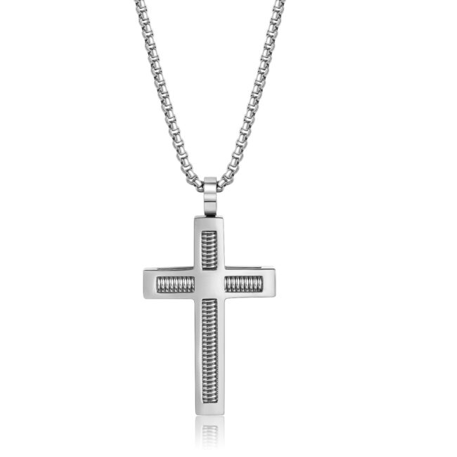 Men’s Stainless Steel Cross Pendant with Steel Spring, available in Steel/Black/Gold colors