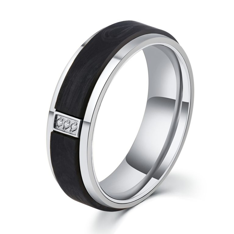 316L Stainless Steel & Forged Carbon Fiber Ring with Black IP Plated and 3pcs White Stones CNC inlaid