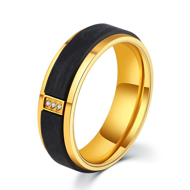 316L Stainless Steel & Forged Carbon Fiber Ring with Yellow gold IP Plated and 3pcs White Stones CNC inlaid